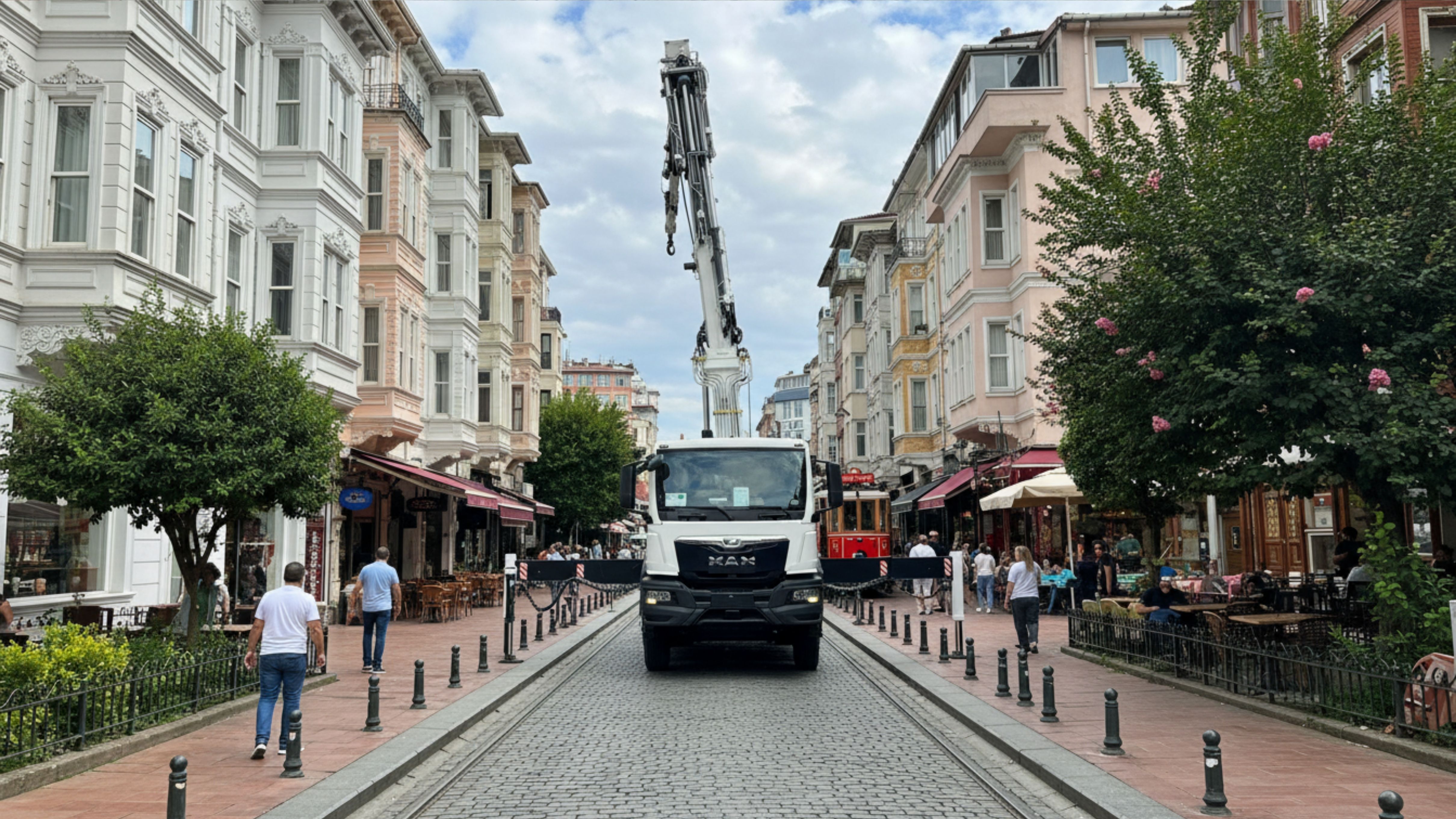 Tramvay Hattı Güvenliği: Vinç bomunu tramvay tellerinin altından veya üstünden güvenle geçiriyor, seferleri aksatmadan operasyonu tamamlıyoruz.